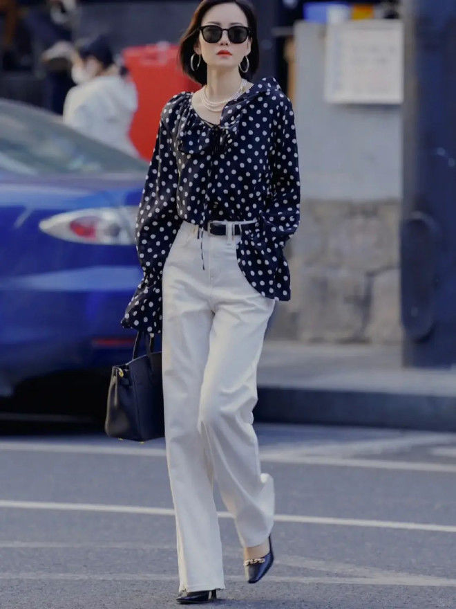 深蓝色波点衬衫搭配白色高腰裤,则是另一套经典之作。深蓝色与白色波点的碰撞。让整个人显得温柔而优雅,而白色裤装的加入,则为这份优雅增添了几分随性与高级。白色与蓝色的搭配,天然具有一种减龄效果,让人看起来更加年轻有活力。