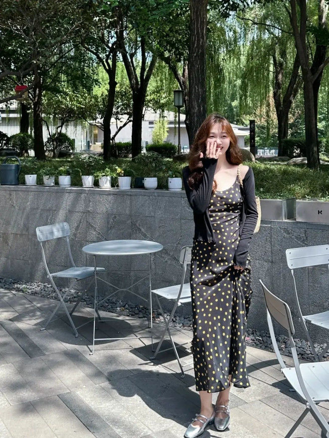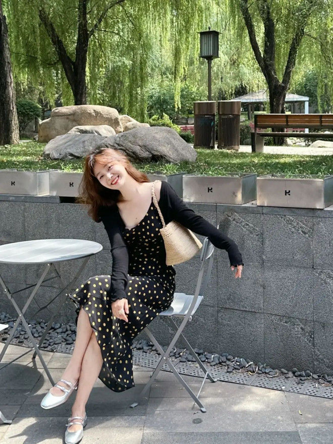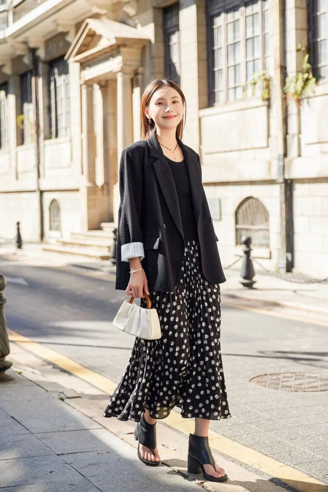 比如,一件黑色小开衫搭配黑底姜黄色波点裙,便能营造出一种复古而优雅的法式风情。而若外套颜色饱和度较高,如黄色西服外套,则内搭的波点裙应选择更为简洁的黑白配色,以突出穿搭重点,避免视觉上的混乱。