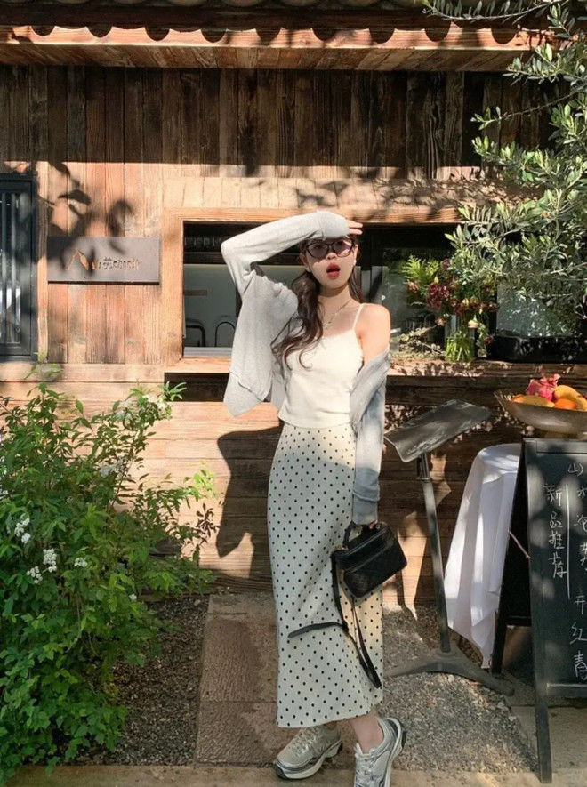 一件灰色短款针织衫内搭白色小吊带,下半身搭配黑白波点裙,便能轻松打造出轻熟的韩式风格,同时融入法式小设计,让整体造型更加亮眼。