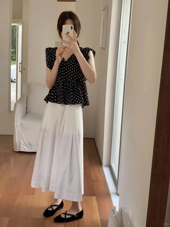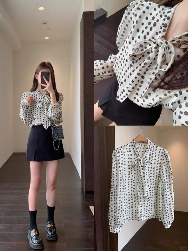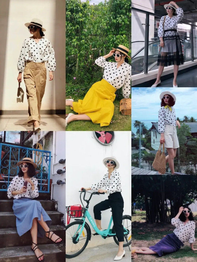 波点上衣,相较于下装,其平铺的波点设计更具存在感,因此在颜色搭配上需更为谨慎。
