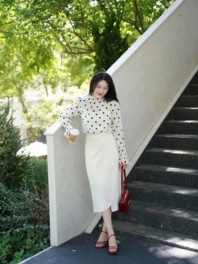 圆点的大小与颜色的选择,往往决定着整体造型的基调。一件雪纺波点衬衫搭配白色一步裙,轻盈的雪纺材质让整个人显得放松而自在,波点的加入,则为这份放松增添了几分俏皮与可爱。