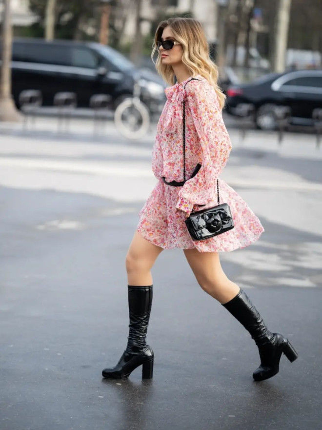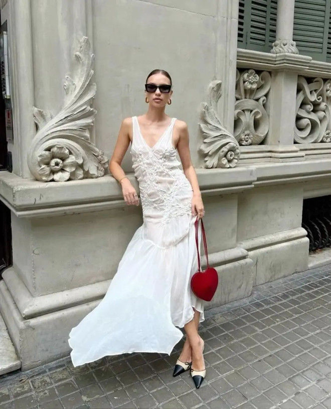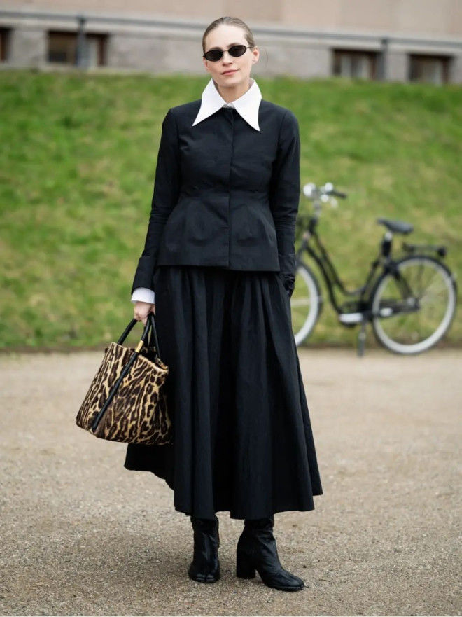 当裙装材质过于轻薄,或者全身配色偏浅,容易造成视觉不平衡。这个时候,一只结构感明确的黑色包可以和鞋子呼应,避免头轻脚重。
