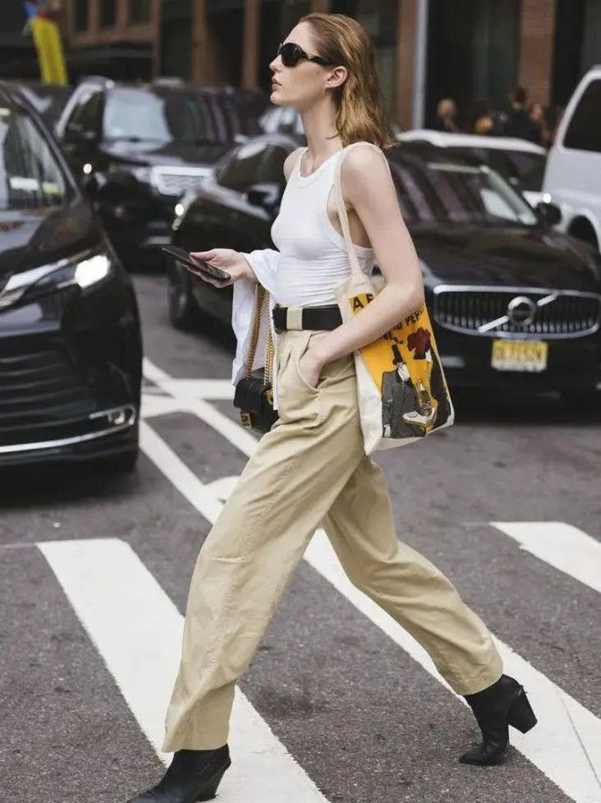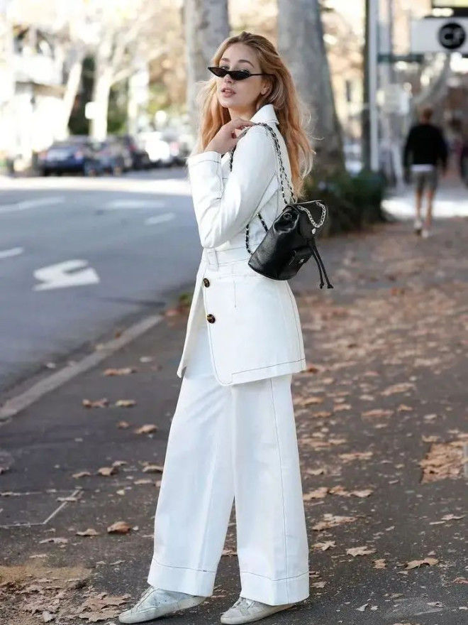 比如浅色系配黑鞋,如果再搭配一个浅色包,整体会没有存在感,黑色包包能为整体注入重心,也提升整体质感。
