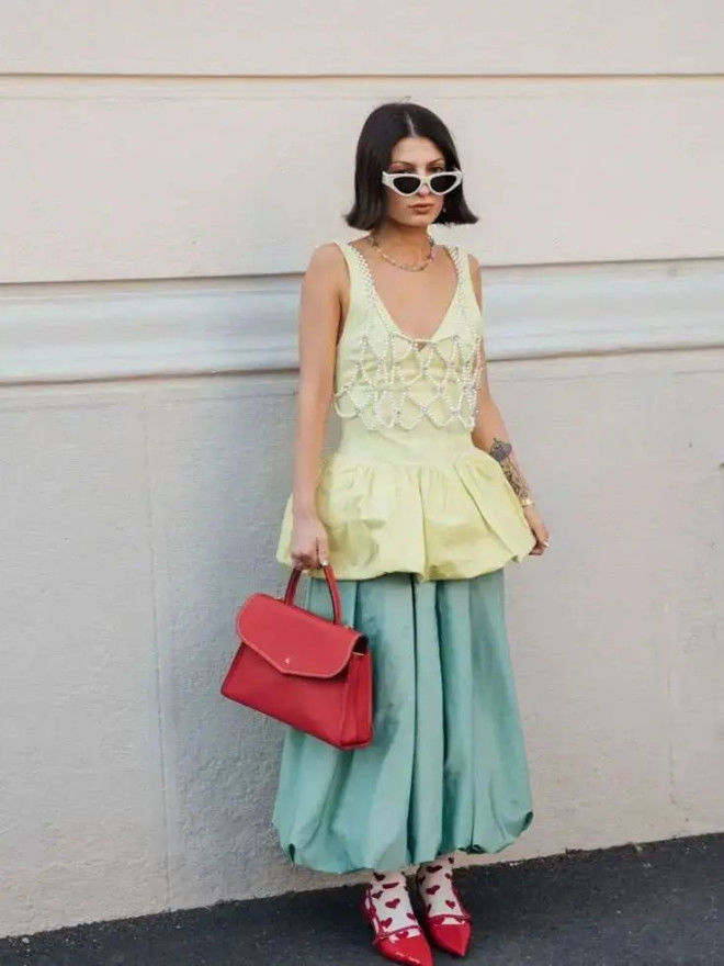 如果衣服本身带有一些设计感,比如泡泡袖、百褶或者不对称细节,那包型就可以选结构简单的,不必抢风头。