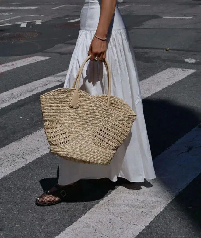 如果担心草编包太休闲,可以选带皮革边框,金属细节的款式,会更精致,也能用于城市穿搭。