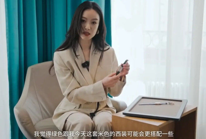 在记录的VLOG里,我们发现原来这只表也是倪妮亲自挑选的呢,她觉得绿色与自己的米色西装会更搭配一些。