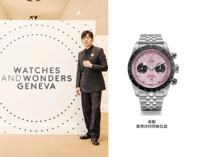 佩戴以Jay的标志性颜色——粉色为表盘元素的碧湾计时型粉红款作品亮相展台,柔和的浅粉色盘经过哑光处理,带有轻微的颗粒感纹理,真的太适合他了!