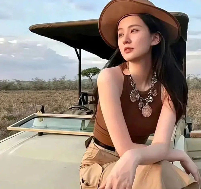 当天乔欣身穿一件棕色的挂脖吊带,头上戴了一顶西部牛仔风的帽子,看起来又帅气又洒脱,妥妥的御姐气质,下身搭配了一条豹纹图案的长裙,自带野性与时尚感,这身帅气打扮,再配上车外一望无际的大草原背景,美人配美景,真是别具一番风情。