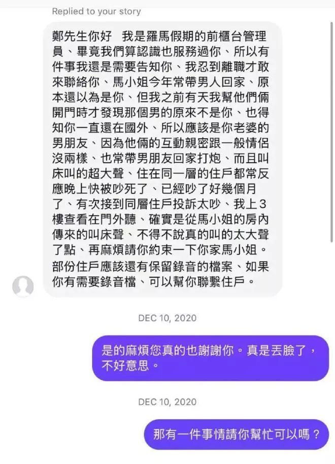 为了证实自己的说法,前夫晒出了与邻居的聊天记录、相关录音等证据。在聊天记录中,邻居明确向前夫表示 “麻烦请您约束你家马小姐”,言语间透露着不满与无奈。