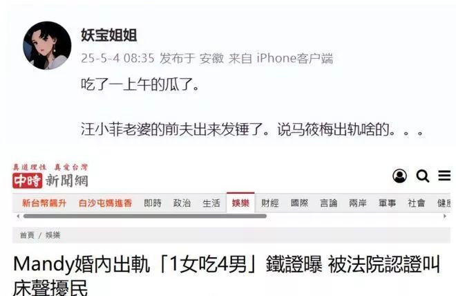 5 月 8 日清晨,台媒一则重磅消息如平地惊雷,将马筱梅推向了舆论的风口浪尖。据台媒披露,马筱梅在与前夫婚姻存续期间,竟同时与三名男子有着密切往来,“1 女吃 4 男” 的惊人指控瞬间引发轩然大波。