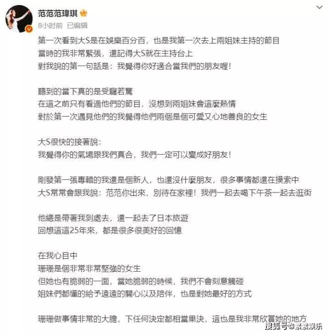 范玮琪的发文和大家的发文都一样,正如小S所期待的一样,想听听大家眼中的姐姐是一个怎么样的人,大家可以写下对大S的各种感受!