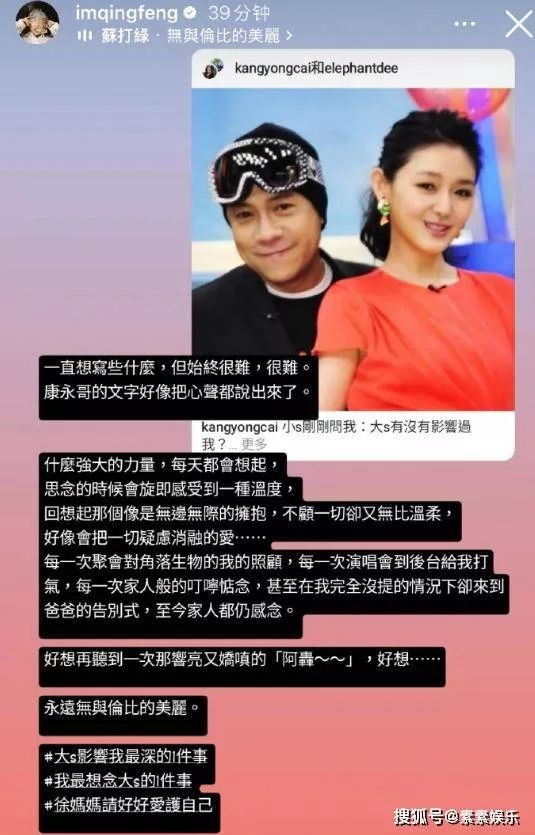 吴青峰用“无与伦比的美丽”来形容大S,同时最后也是带上了“徐妈妈请好好爱护自己”的话题。