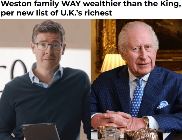 在2025年最新公布的《星期日泰晤士报》英国富豪榜上,加拿大韦斯顿家族一跃进入第六名,家族资产高达177.46亿英镑(约330亿加元),超过国王查尔斯三世陛下。这个起家于多伦多面包店的商业家族,如今在横跨大西洋的财富帝国中,坐拥从超市、药妆、快时尚到奢侈百货的广阔版图。