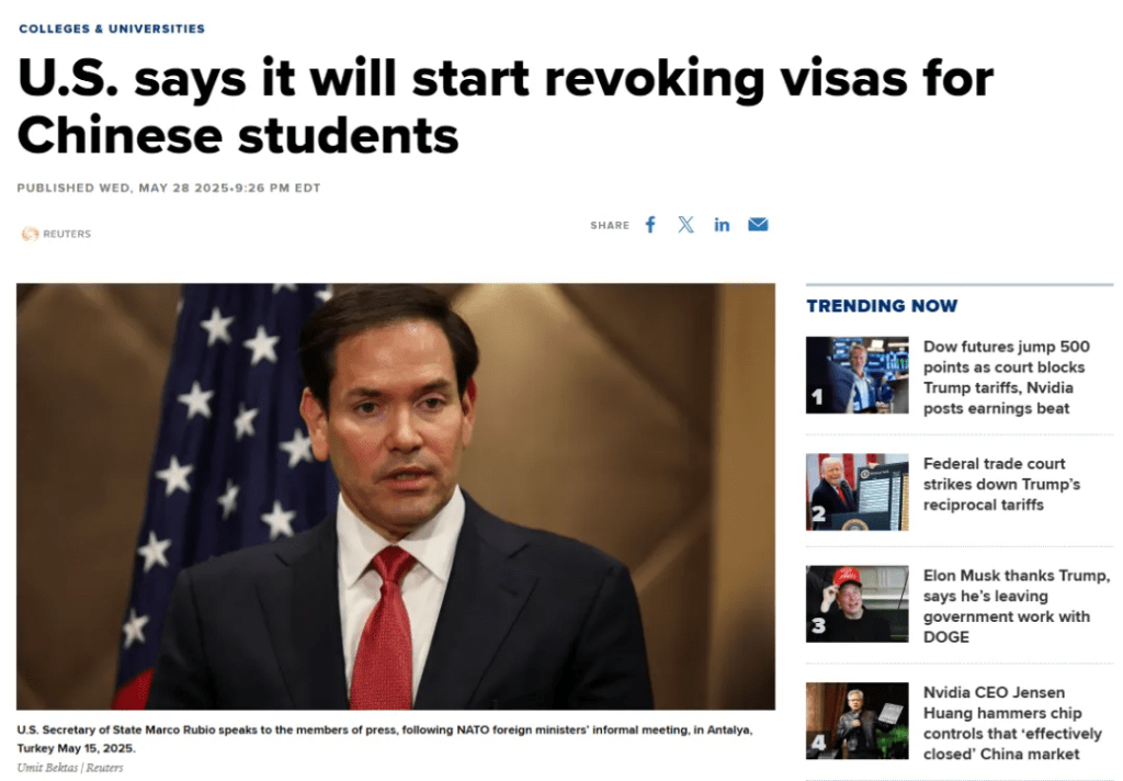 5月28日,美国政府宣布将“积极撤销”部分中国留学生签证,理由是“国家安全”以及与“中国政府或关键科系的关联”。虽然官方并未公布具体名单或甄别标准,但许多中国学生已自觉“中招”,有人开始删除社交媒体记录,有人则干脆放弃原定的回国假期。