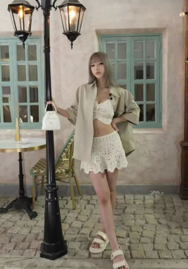 而现在的拍摄,完全走向韩系风了,一双大长腿很吸睛。