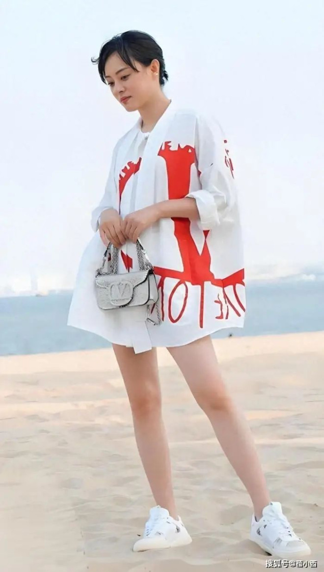 不管是去海边游玩,还是上班、购物,穿中长款衬衫时下身最好搭一件短裤,上长下短是很流行的穿搭技巧,是显腿长的好方法。