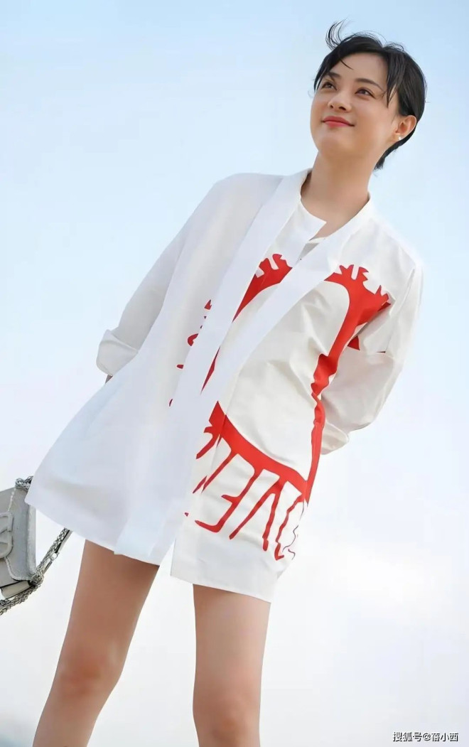 身上这件以白色为底色,印有大型红色图案,两色的碰撞散发出浓浓的时尚气息。