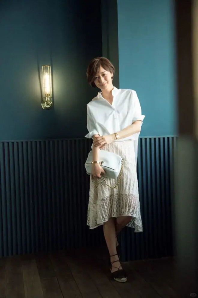 白色廓形衬衫,搭配米色雪纺蕾丝半裙,将衬衫下摆塞进裤腰既抬高腰线,又能打造优雅干练的利落感,尽显优雅女人味。这些色调清浅温柔的色彩,不仅好驾驭,还能营造出纤细美感,让50岁女性的体态看起来更优美轻盈。