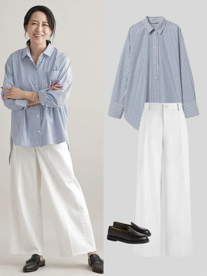 浅蓝色条纹衬衫搭配白色九分阔腿裤,条纹元素更显身材苗条轻盈,搭配纯色阔腿裤,简约却不简单。这种配色方式,既符合50岁女性的年龄特点,又能展现出她们的优雅与从容。