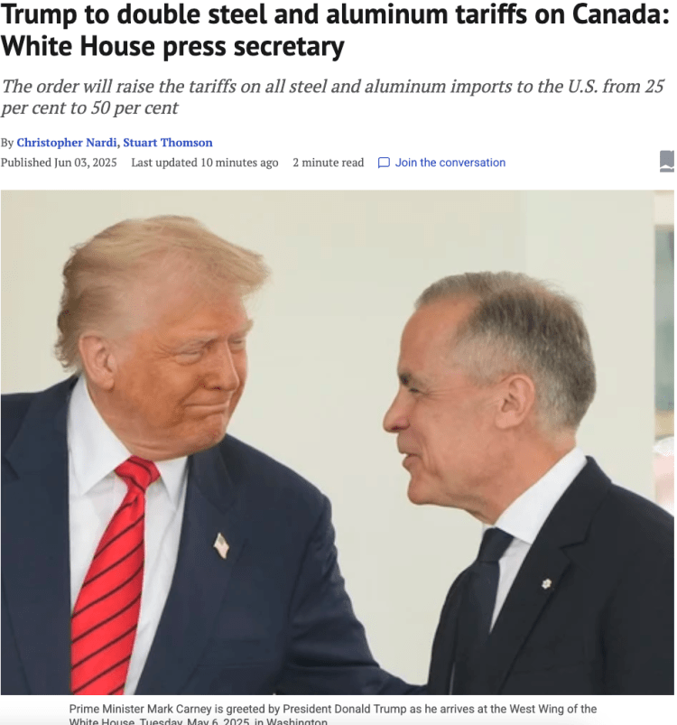 周二上午,美国白宫正式宣布,总统特朗普签署行政命令,将对加拿大钢铁和铝产品的进口关税从25%提高至50%。新关税将于周三生效。这一决定迅速在渥太华政界、工业界引发强烈震荡。