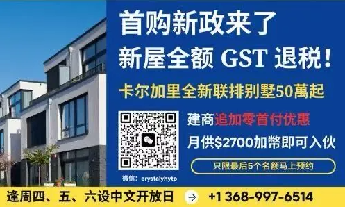 联邦刚宣布:首次购房者购买$150万以下新建住宅可享全额GST退税,等于最多可省下$75,000!
