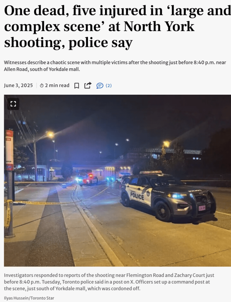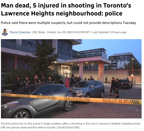 多伦多北约克,2025年6月4日——周二傍晚,夏日刚刚降温的北约克Lawrence Heights社区,在一阵突如其来的枪声中,被永久改写了宁静表象。至少20声枪响撕裂天幕,一名男子死亡,五人受伤,嫌犯在逃。