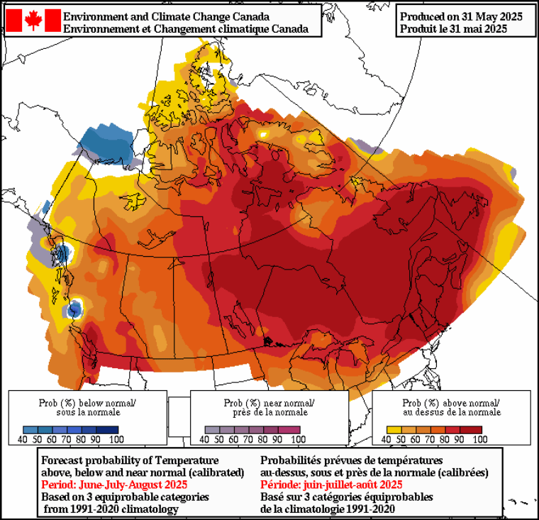 根据加拿大环境部和气候变化部(ECCC)最新预报,今夏大温三个月内“气温高于正常”的几率高达87%。虽然气象模型尚不能明确判断是否会出现热浪或多轮极端高温,但可以确定的是,这将是一个不同寻常的季节。