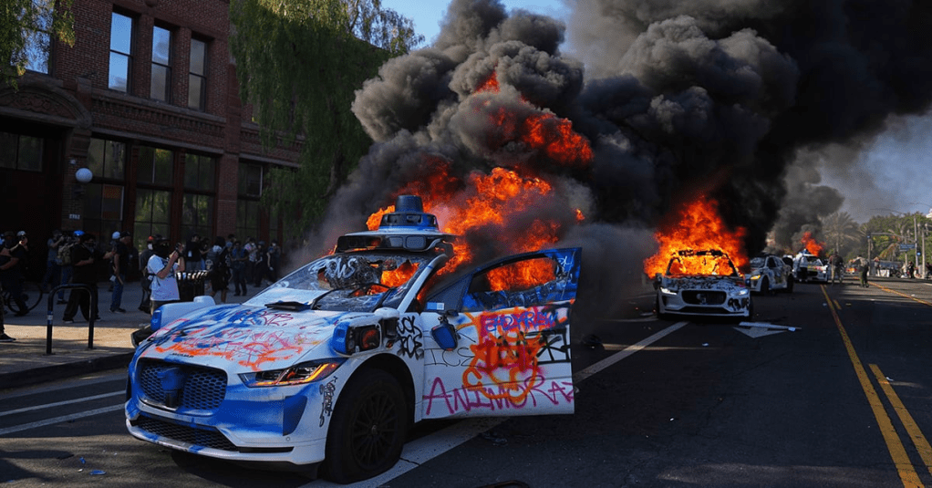 6月6日,美国移民与海关执法局(ICE)突袭洛杉矶一家服装工厂,逮捕数十名涉嫌无证工作的移民,引发抗议风暴。随着怒火蔓延,抗议者封锁高速路,甚至利用Waymo无人出租车实施破坏,数辆车被砸毁、焚烧,空气中弥漫着锂电池爆炸后释放的有毒烟雾。