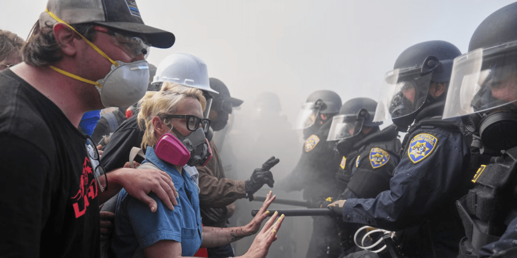 川普在社交平台X上称:“我们正在夺回城市。” 并直接点名加州州长纽森“失职”,扬言“应予逮捕”。白宫宣布动员2000名国民警卫队进驻洛杉矶,州长并未签署授权令,这成为自1965年瓦特骚乱以来最具争议的联邦出兵。