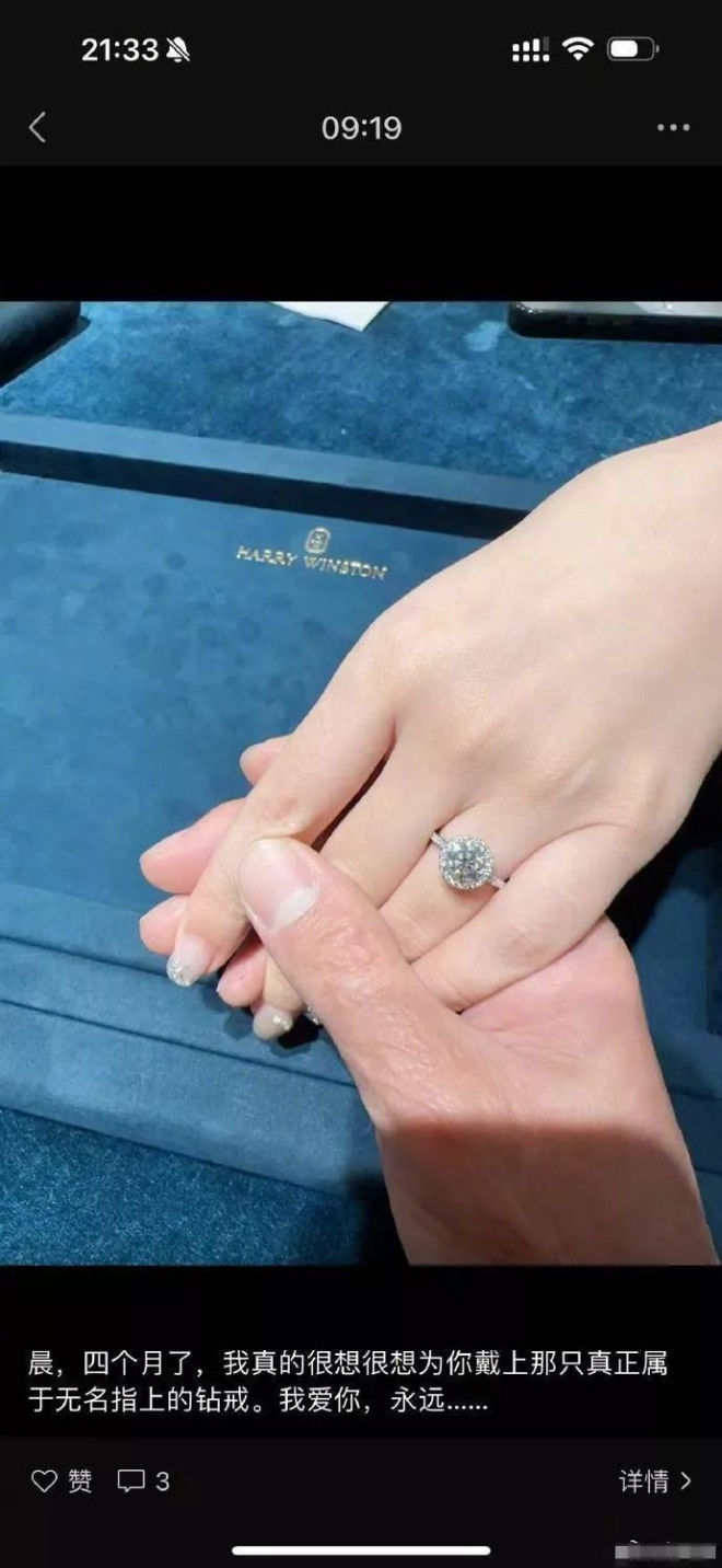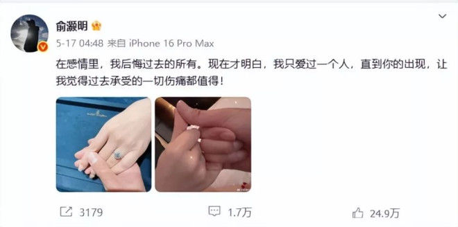 5月17日凌晨,俞灏明突然晒出一张戴钻戒的照片。