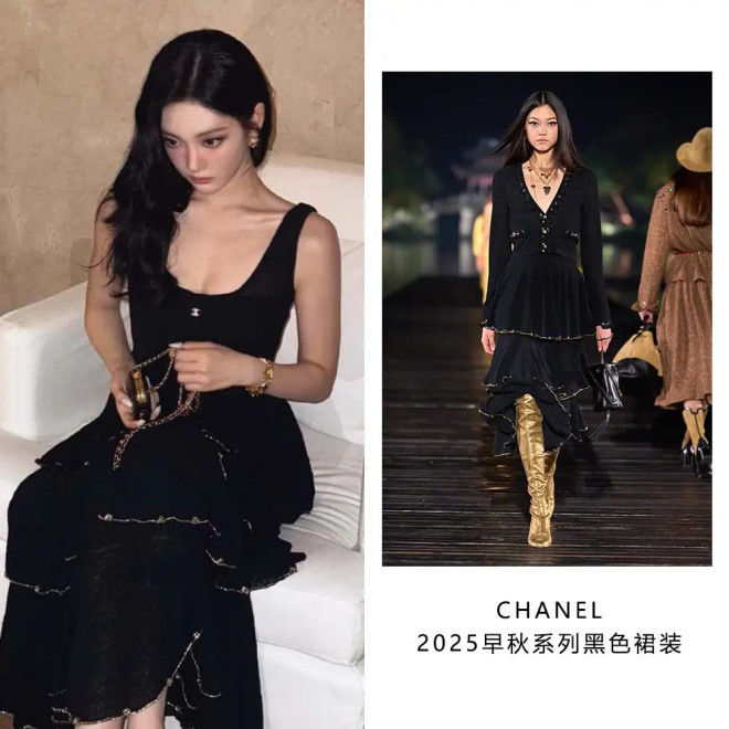既可以驾驭性感,同样又能低调优雅,身穿香奈儿2025早秋系列的黑色镶边裙装,千金归来既视感。裙摆精致的层叠设计与金色绣片镶边,每一处都在诠释时尚巧思,让人眼前一亮。