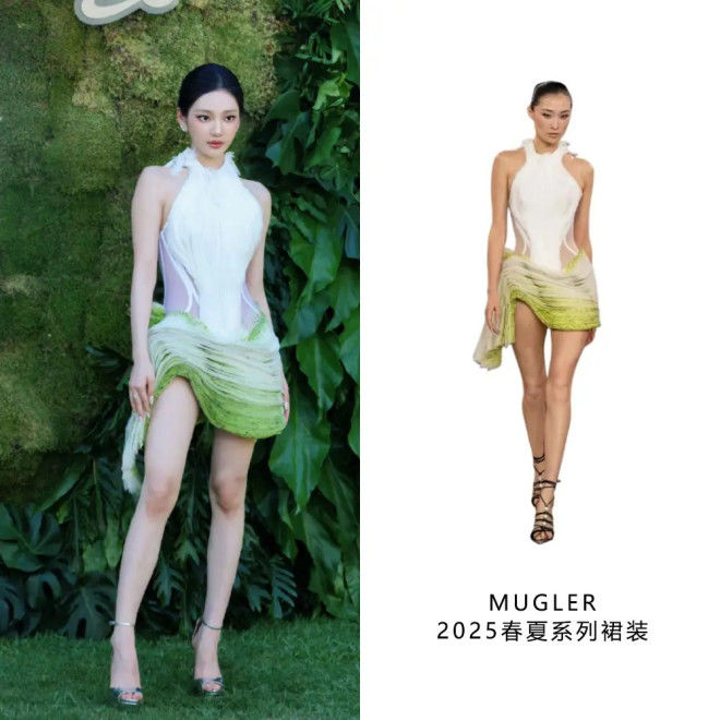 身MUGLER2025春夏系列渐变裙装亮相VOGUE活动,在众星中依旧闪亮,真的太优越了。流水般的线条层叠线条设计,与身材曲线交相辉映,灵动又充满韵味,利落的中分发型气场十足,美到发光。