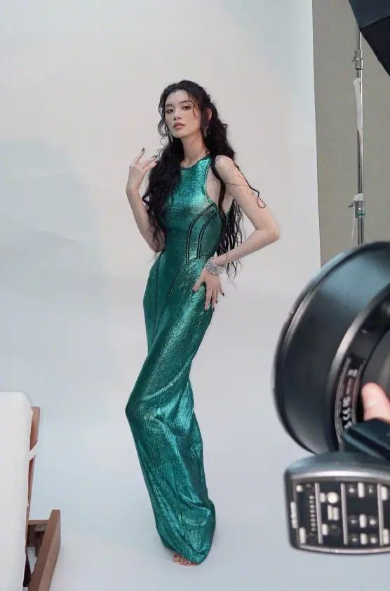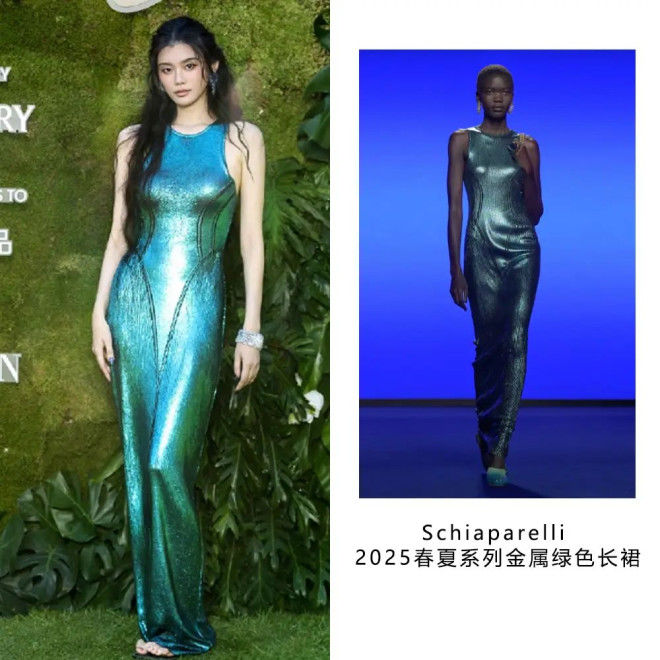 不愧是超模,奚梦瑶参加Vogue的活动身穿Schiaparelli 2025春夏系列金属绿色长裙,修身的款式将她超模的身材优势尽显,金属光泽又呈现未来感,配着湿发造型,与海边的景色巧妙呼应,如出水美人鱼一般惊艳。