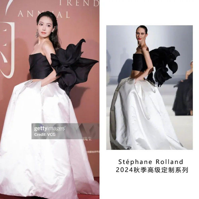 在COSMO盛典的红毯上,明星们的造型可以说是大部分都很普通,宋茜一Stéphane Rolland2024秋季高级定制系列黑白礼服惊艳众人,本次红毯最优造型So姐要投给她,缎面廓形裙摆配黑色抹胸,高级又华丽,更有趣的是翅膀装饰让这套裙装更有童趣,为红毯增添一丝趣味性。