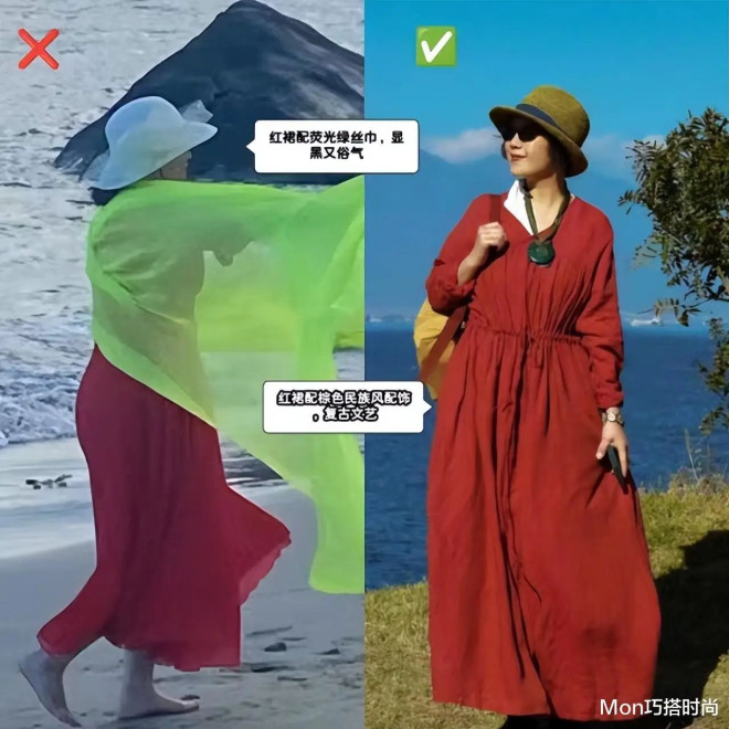 比如这条红裙搭了错误的荧光绿丝巾,显肤黑又艳俗;配上合适的棕色系民族风项链、手链后,复古文艺气质立显……