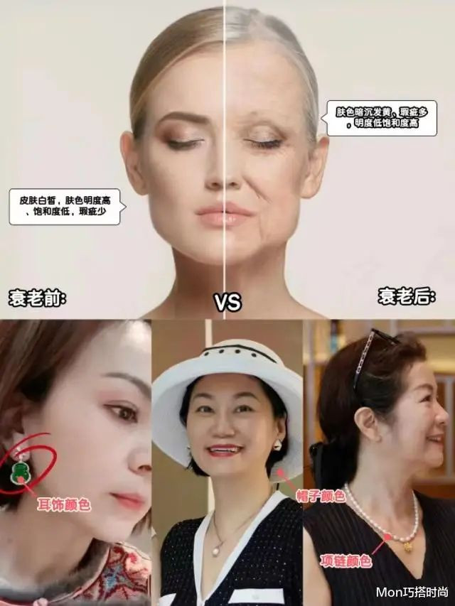 上了年纪后的肤色也会比年轻时暗沉发黄不少,还会有明显的老年斑、雀斑等瑕疵,肤色明度低、饱和度高。