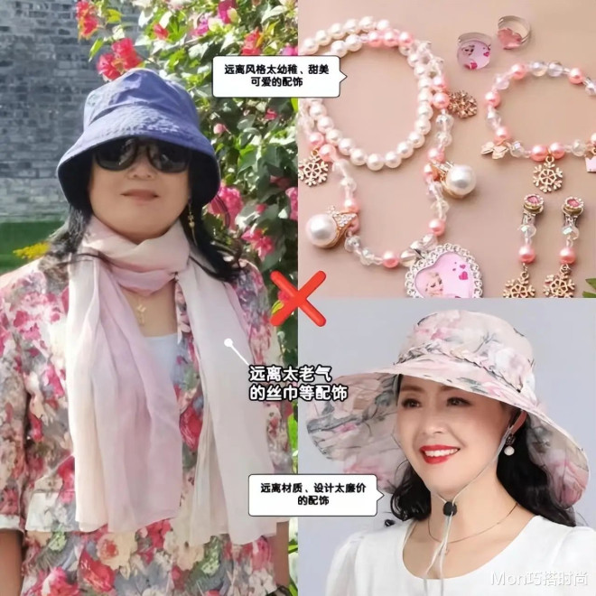 手镯、丝巾等一眼显老的配饰得远离;风格太可爱、幼稚、甜美的配饰和五六十岁气场不合,也别碰;网纱、蕾丝、亚克力等易显廉价的材质更别乱用!