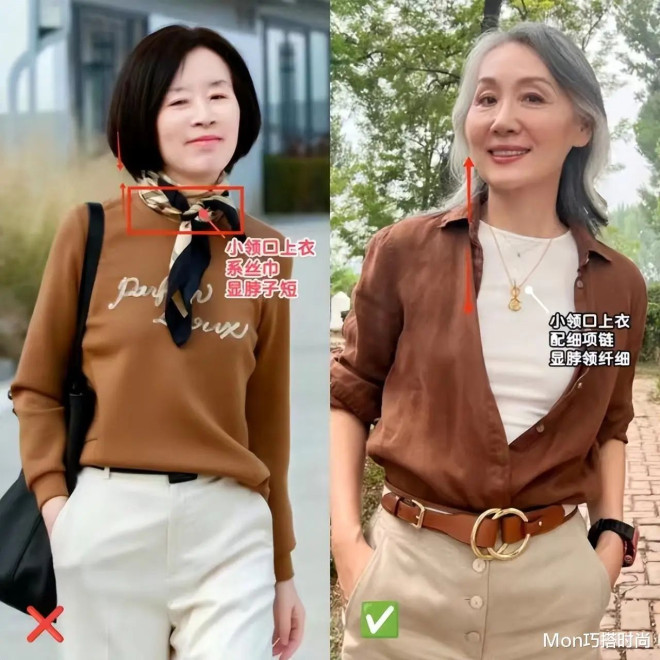 要是老了穿裙还系丝巾,那就更容易“翻车”了!丝巾可不是一般人能驾驭的,就算平常最百搭的白裙配上彩色丝巾后,还不是照样变油腻?