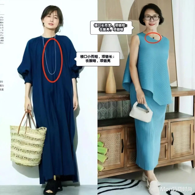 项链不仅要“选”对,还得会“搭”。裙子或上衣的领口小而高,项链要长;大领口则要配短项链。