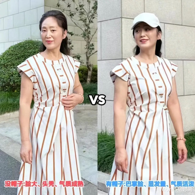 此外,很多老了以后依然优雅大方的女性,配裙也离不开“帽子”。帽子不仅能修饰脸型、显脸小,还能盖住令人烦恼的秃头和高发际线呢!