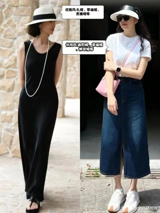 裙和帽子不割裂,协调感很关键。如左边走优雅路线,小黑裙配珍珠链,帽子便可选优雅的礼帽。右边牛仔裙配运动鞋,风格休闲,遮阳帽、棒球帽、渔夫帽皆可。
