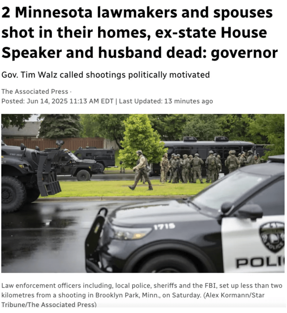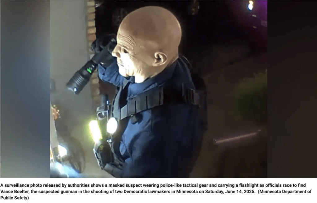 在一场被美国媒体称为“最具政治震撼力的地方暗杀案”中,明尼苏达州两位资深议员于6月14日凌晨接连遭遇枪击袭击,一人身亡、一人重伤,作案者竟身穿仿制警察制服、驾驶“几可乱真”的伪装警车,并手持一份列有70人政要的“暗杀名单”。