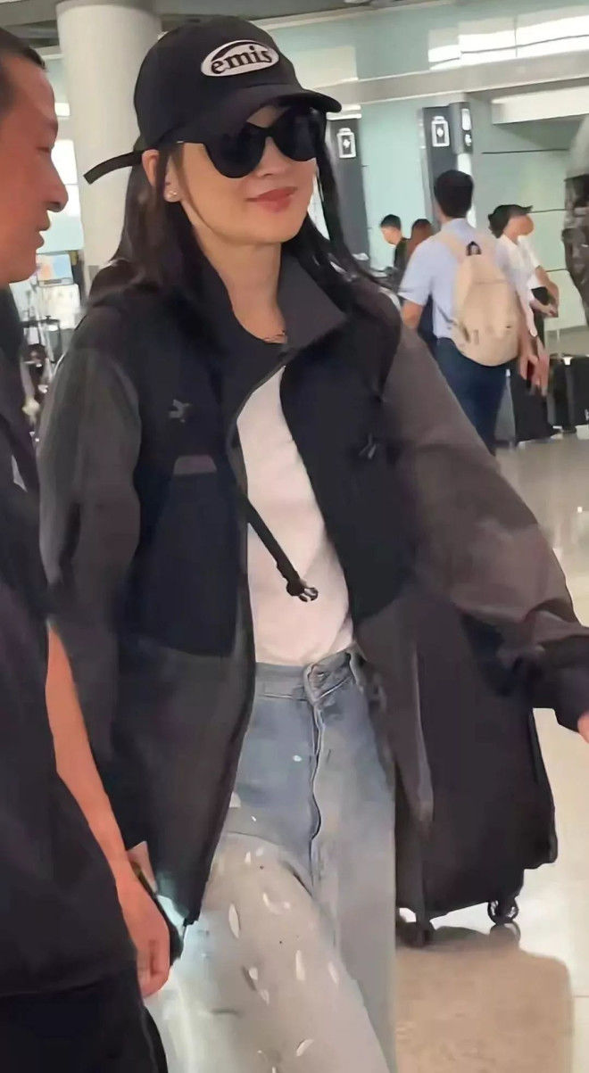 回到北京的梅婷打扮休闲:白色T恤配牛仔裤,身上还穿着似乎是丈夫曾剑的外套。她背着背包,戴着墨镜,状态完全不像五十岁,看起来就像三十多岁一样。