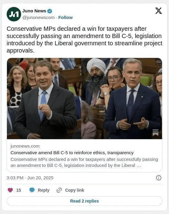 在加拿大全国政坛结束春季议会之际,一桩罕见事件成为焦点:自由党和保守党这两大历来对立的政党,竟在《重大项目法案》(C-5)上达成一致,全体保守党议员投票支持自由党提出的关键立法。这一“非常规联盟”不仅令外界震惊,也使保守党领袖皮埃尔·博励治(Pierre Poilievre)的党魁地位岌岌可危。