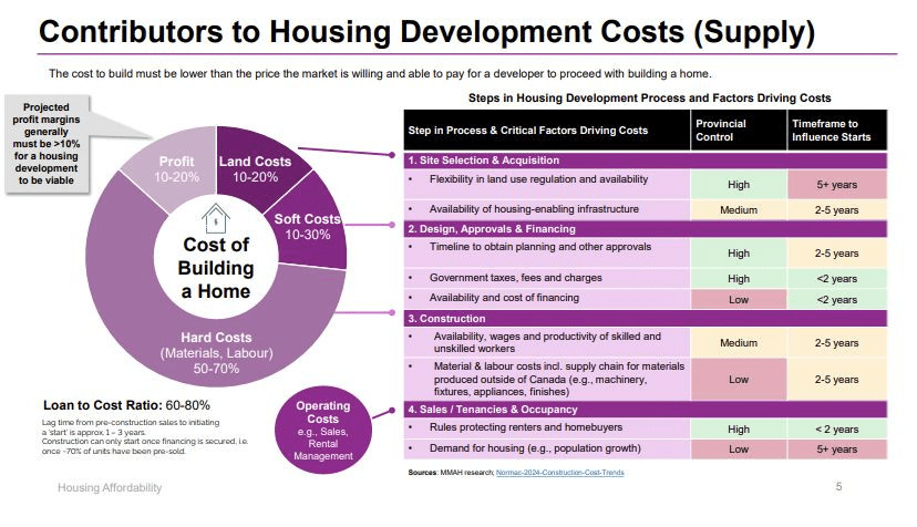 据《彭博社》获得的安省住房厅内部简报显示,在一套新房的开发成本中,高达30%为税费与行政审批成本,这与开发商利润几乎相当。更关键的是,开发商在当前环境中已被迫将利润压缩至10%以下,难以获得银行融资支持。