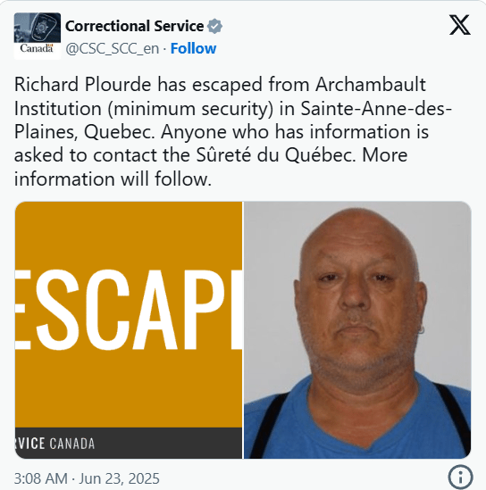 加拿大惩教署(CSC)确认,逃脱者为Richard Plourde,他曾于1988年对一起震惊蒙特利尔社会的二级谋杀案认罪。当年受害者是24岁的年轻牙医Nathalie Tetreault,她在下班途中被袭击,遗体在Kirkland的林中被部分掩埋。Plourde随后被判终身监禁。