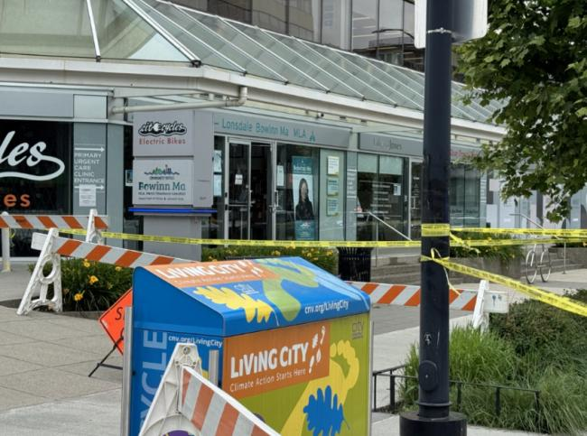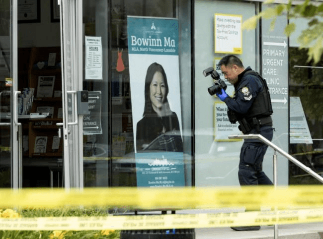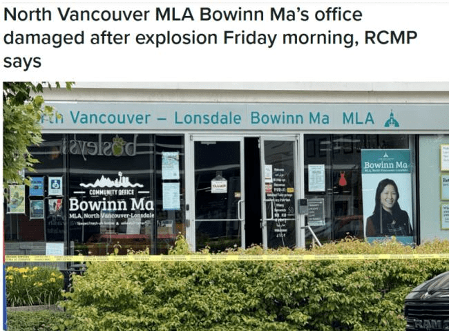 6月27日凌晨,卑诗省基础建设厅长、北温—Lonsdale选区省议员马博文(Bowinn Ma)的选区办公室遭遇爆炸袭击。爆炸装置被安放在正门前,猛烈冲击力炸毁了大门并造成建筑部分损毁,所幸事件未造成人员伤亡。事件发生后,加拿大皇家骑警(RCMP)迅速出警,爆炸物处理小组、警犬部队与法证团队联手封锁现场并开展调查。
