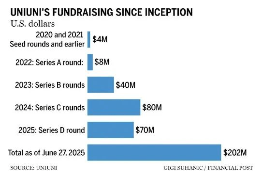 UniUni,这家由华人创业者Peter Lu与Kevin Wang于2019年创立的物流企业,在短短六年内从每日配送千单成长为日派送60万件的区域巨头。今年累计融资达2.02亿美元,正被媒体称为“加拿大下一家科技独角兽”。
