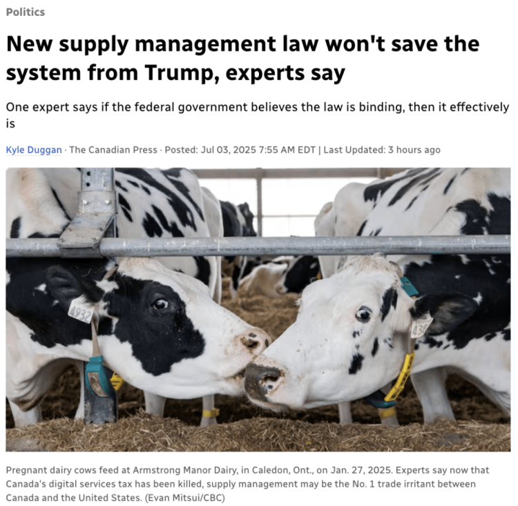 为抵御压力,加拿大国会6月底通过了C-202法案,名义上禁止外交部长在未来的贸易谈判中以开放配额或降低关税作为交换条件,尤其涉及奶、蛋、禽类等供应管理产品。魁北克政团将此视为“农业主权的胜利”,尤其是在乳制品为地方经济命脉的魁省。