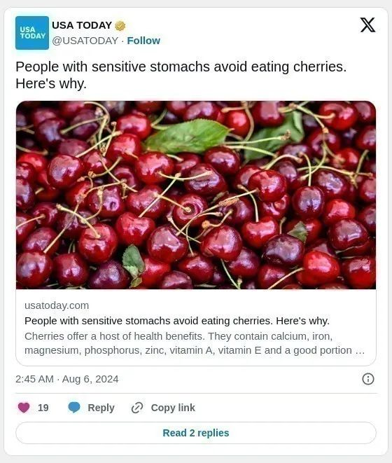 但在果香扑鼻的背后,这颗小巧水果也有“令人不适”的另一面。营养学家提醒,樱桃虽甜,胃肠不适的人请适量为上。